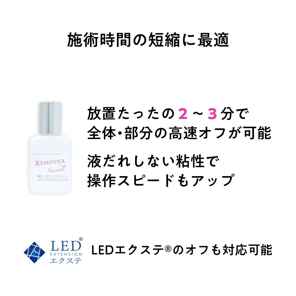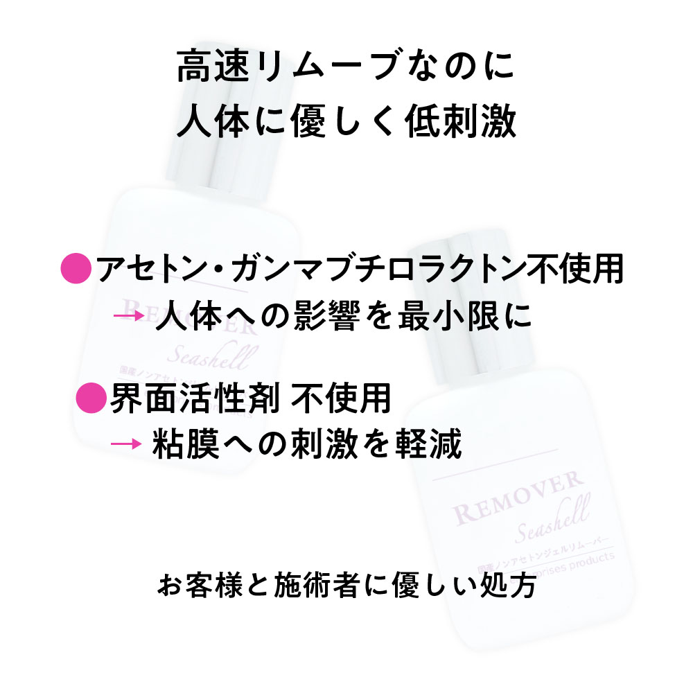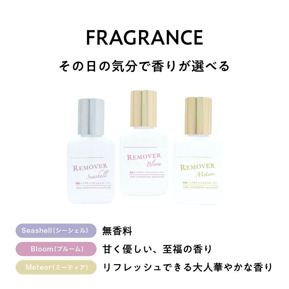 お客様がその日の気分によって香りを選ぶことができたり、リムーブ中も心地良く施術を受けれるように、選べる香り3種のリムーバーをご用意。Seashell(シーシェル):無香料