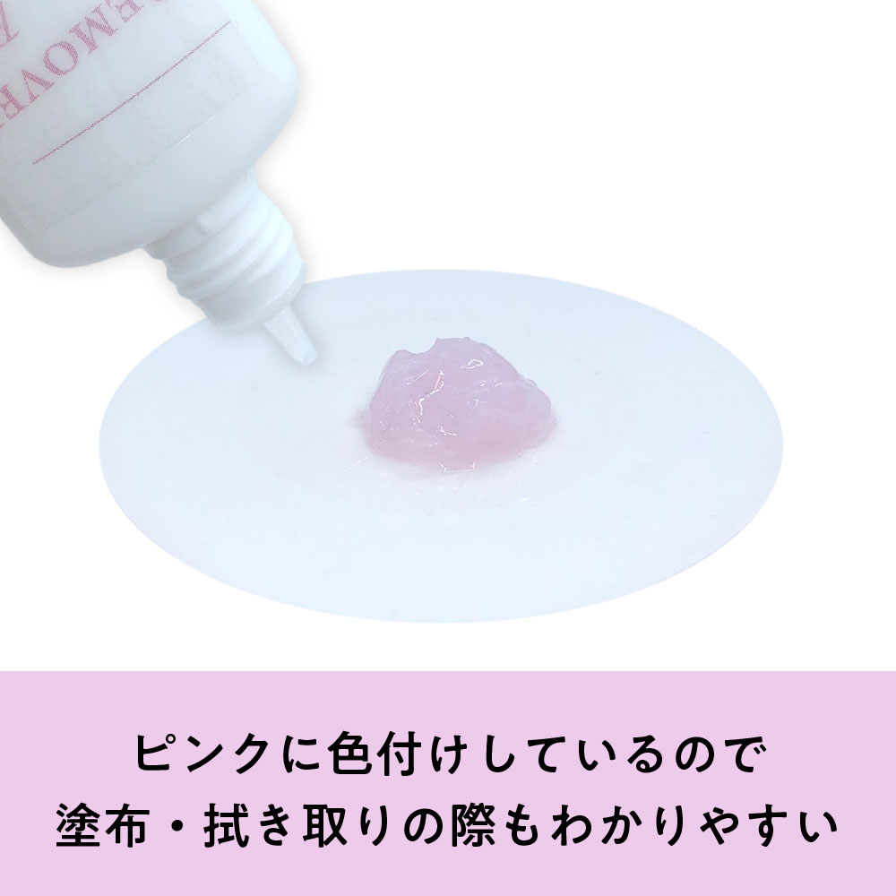 ピンクに色付けしているので塗布する際も拭き取りの際もわかりやすい。1回でしっかりグルー接着面にリムーバーをのせる事ができるので余分な時間もかからず、拭き取り残しの心配もありません。