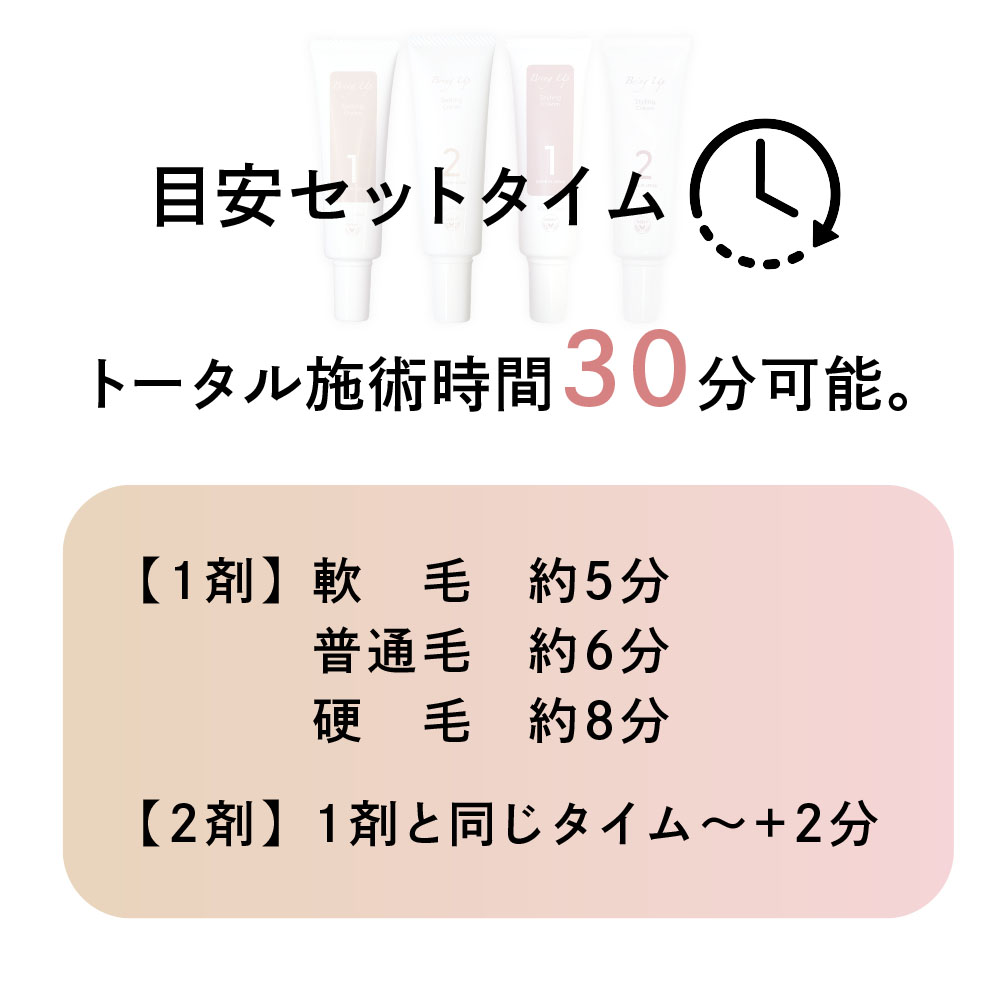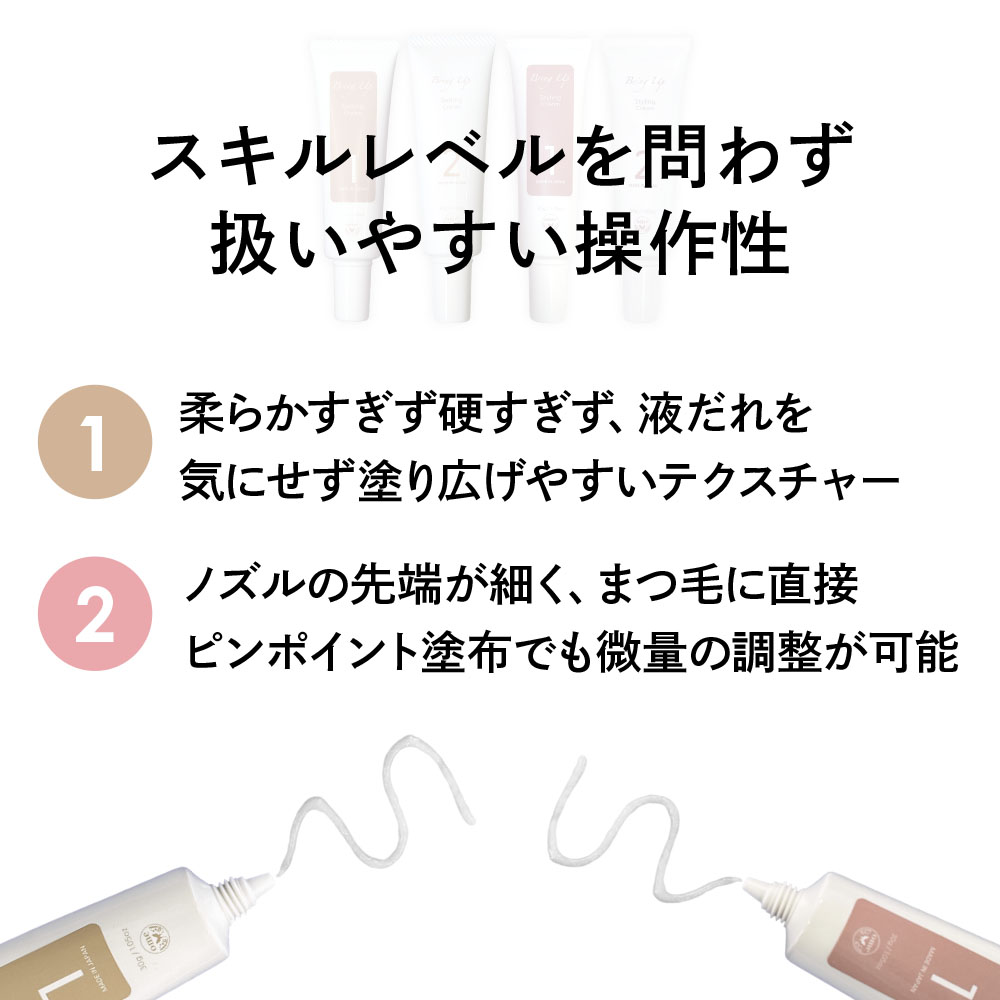 1.まつ毛の油分をきれいに拭き、まつ毛をロッドに巻き付けます。2.BUセッティングクリーム1(またはBUスタイリングクリーム1)をまつ毛に適量塗布し、約6分間を目安に放置(軟毛 約5分/普通毛 約6分/硬毛 約8分)