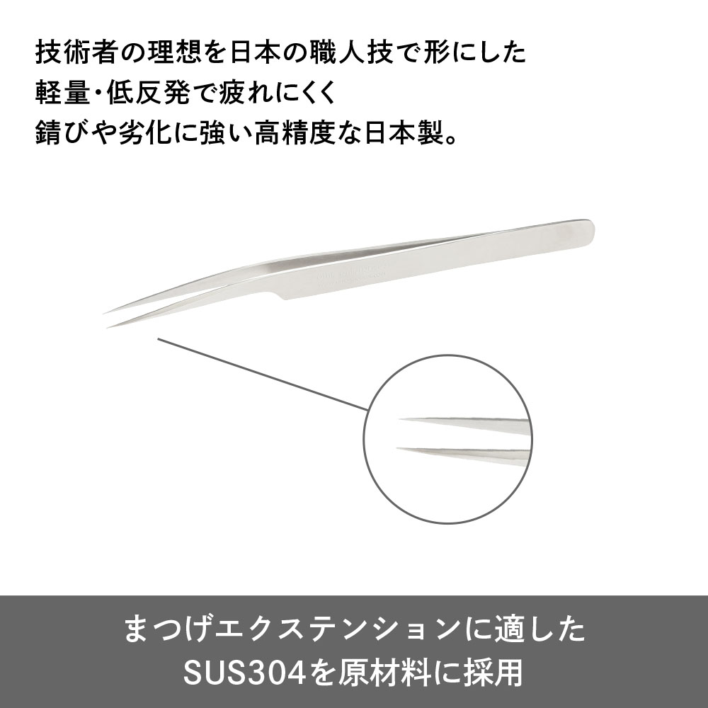 先端に少し角度があり、お客様の鼻に当たらずに施術できるようにも工夫された形状の国産ツイーザーです